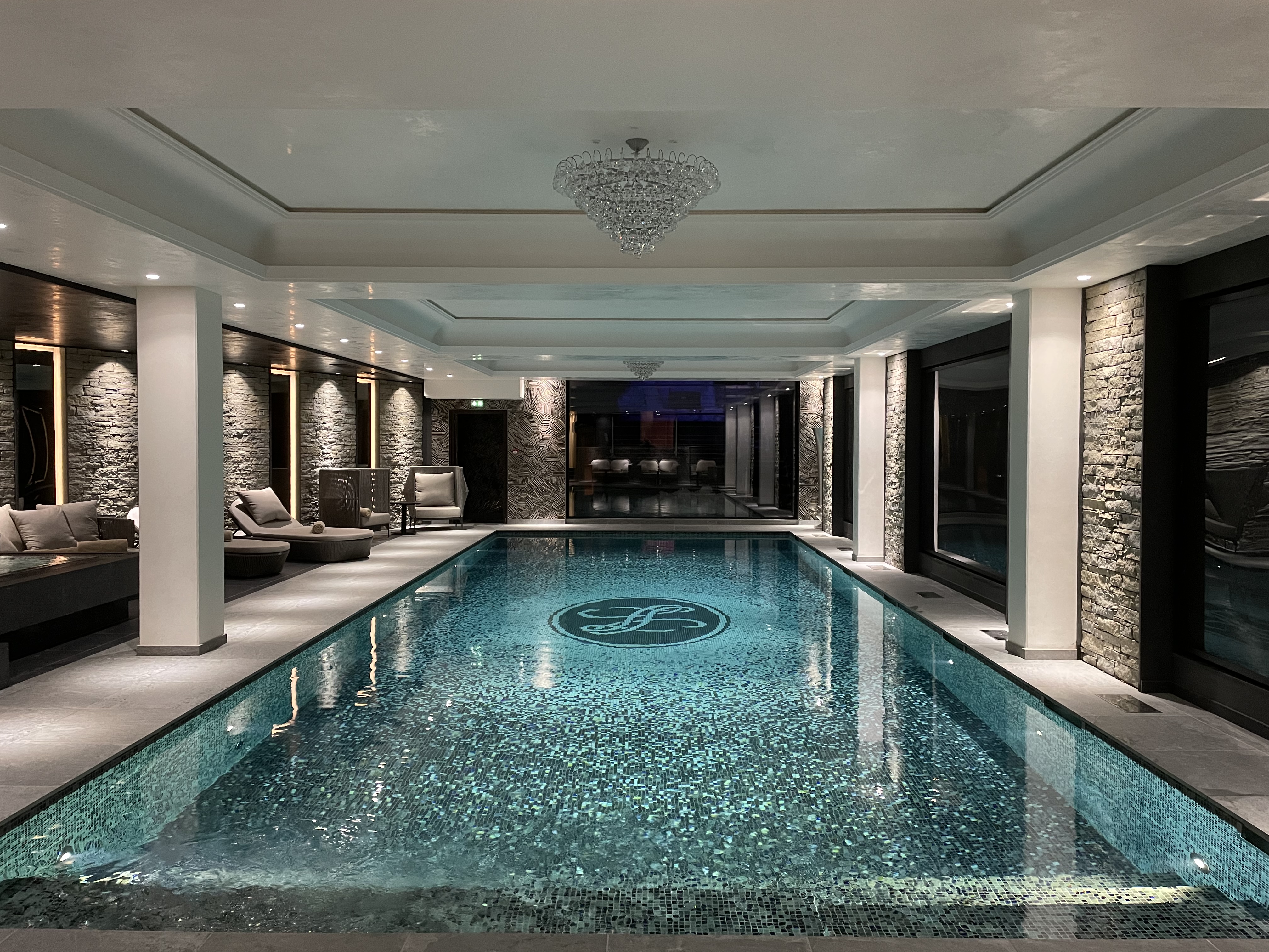 Espace bien-être conçu dans un chalet privé, avec un programme complet : piscine intérieure, bain froid, spa, hammam, douche sensorielle et sauna.