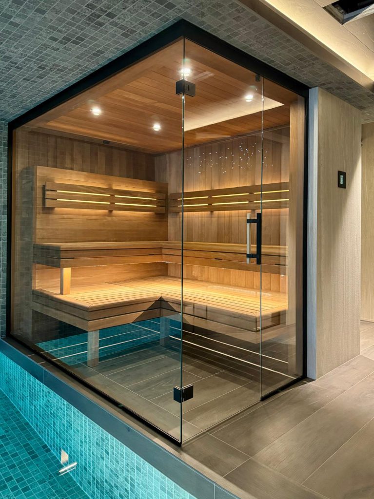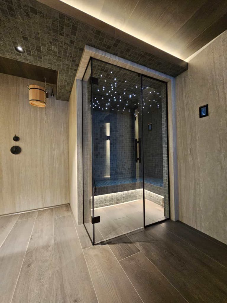 Espace wellness conçu autour d’un usage régulier, avec une attention portée aux enchaînements, à la ventilation et au confort thermique. L’ensemble privilégie une lecture simple, des matériaux adaptés au milieu humide et une technique intégrée de manière discrète.